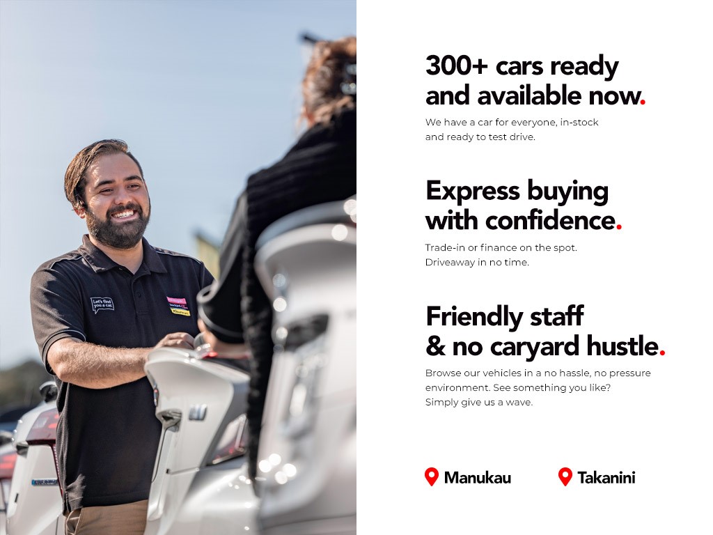 We make buying a car easy, fun, and stress-free. Whether you're browsing from home or visiting our Manukau or Takanini branches, our friendly team is here to help you find the right vehicle - no pressure, just helpful advice and great service.